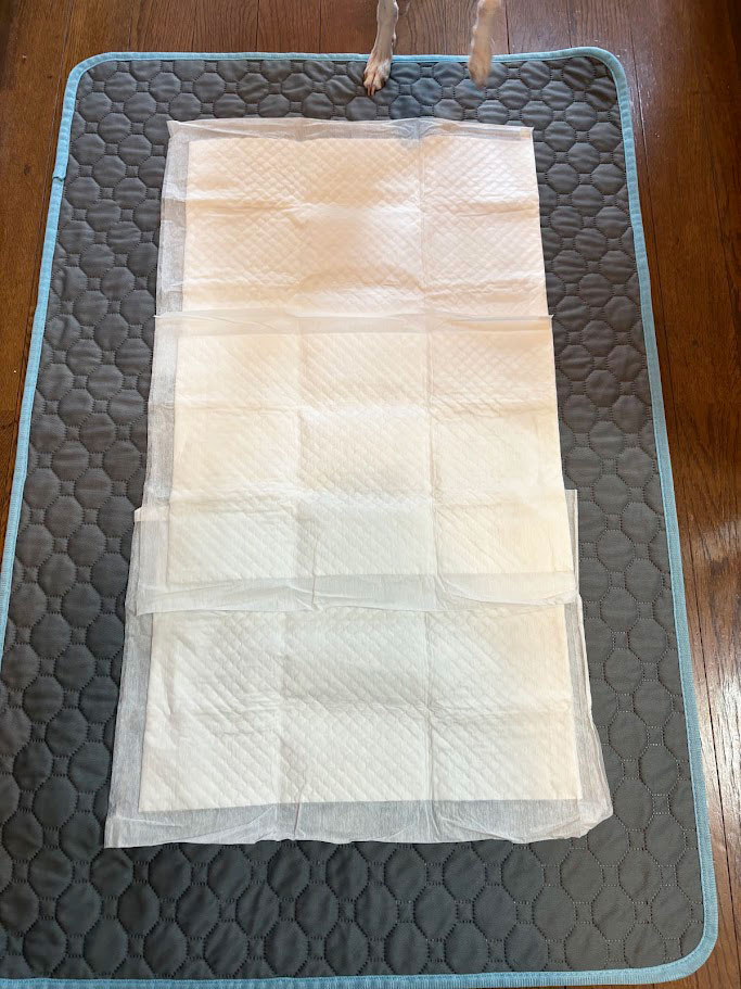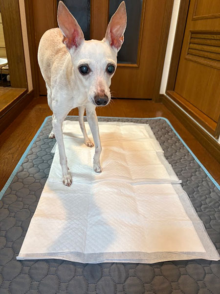 トイレトレーを外して、床に直接トイレシートを敷くと、戸惑うことなくすんなりトイレをしたので、飼い主も「なるほど。プラスチックの音がダメになったんだ・・・」と理解しました。