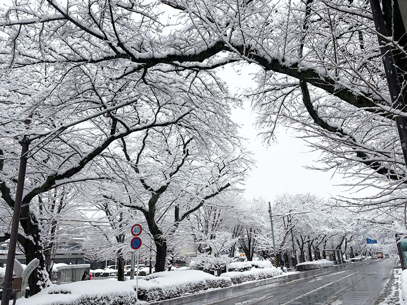市役所の桜通りの歩道は、大きな桜の木の枝で、雪が積もっていなくて