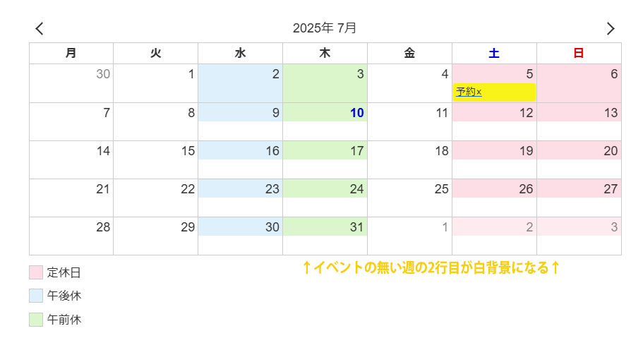 終日(イベントの無い週の2行とも)指定の背景色表示される。